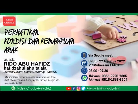 Kajian Orangtua yang In syaa Allah akan di laksanakan pada : 🗓 Hari/Tanggal : Sabtu, 27 Agustus 2022 M/ 29 Muharram 1444 H ⏰ Waktu : 08.00 - 09.30 📚 Tema: Perhatikan Kondisi dan Kemampuan anak 👤 Pemateri : Rido Abu Hafidz Hafidzahullahu ta'ala Online via aplikasi google meet "Barang siapa menempuh jalan untuk mencari ilmu, Allah akan permudah baginya jalan menuju syurga” (HR. Muslim No. 2699) ════ ❁✿❁ ════❁✿❁ ════❁✿❁ ════Official